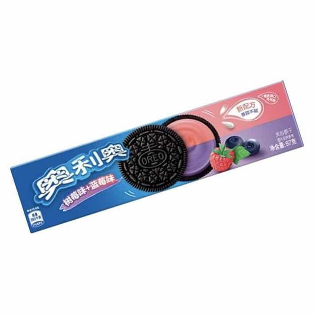 Oreo Чорниця-Малина - це смачний, густий заварний крем зі смаком чорниці та малини, загорнутий у два круглих шоколадних печива.